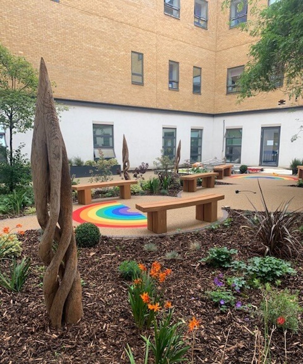 The external areas were excavated and prepared to receive new resin surfacing which included morale boosting rainbow connotations of the NHS and new planted areas to achieve the Hospital’s vision.