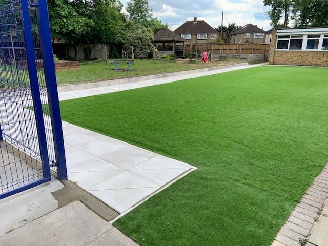 Within the same area of the school our team were employed to carry out upgrade works to an existing unused external area. We installed a new artificial grass playing surface and concrete slabbed walkway between classrooms. These works were carried out in a very short timeframe to ensure the children could enjoy the new space before they returned to school after the half term.